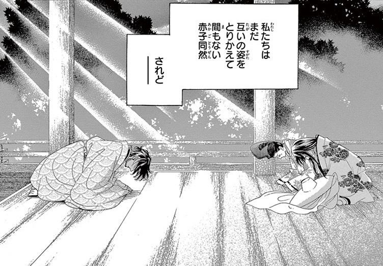 Following the previous chapter’s visit to Uji to check in on Sara’s depressing storyline, we get the conclusion to Suiren’s dilemma in Heian-kyo. Everyone at court now knows that the Emperor has requested Suiren as a wife, so Suiren returns from her brief absence to give Togu an explanation. Togu assumes she has accepted the Emperor’s proposal and offers congratulations, having made an effort to get over her previous jealousy.