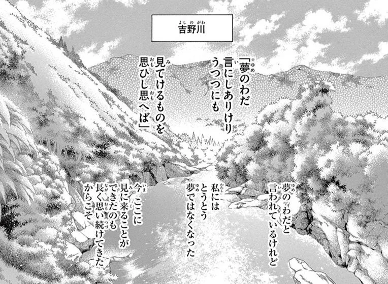 At the beginning of Episode 13, Togu and her entourage reach Yoshino, and the chapter opens with her looking out upon a body of water where two rivers, the Yoshinogawa and Kisadanigawa, meet. She then appears to recite a poem, shown first in classical Japanese, and then followed by an explanatory modern Japanese version: