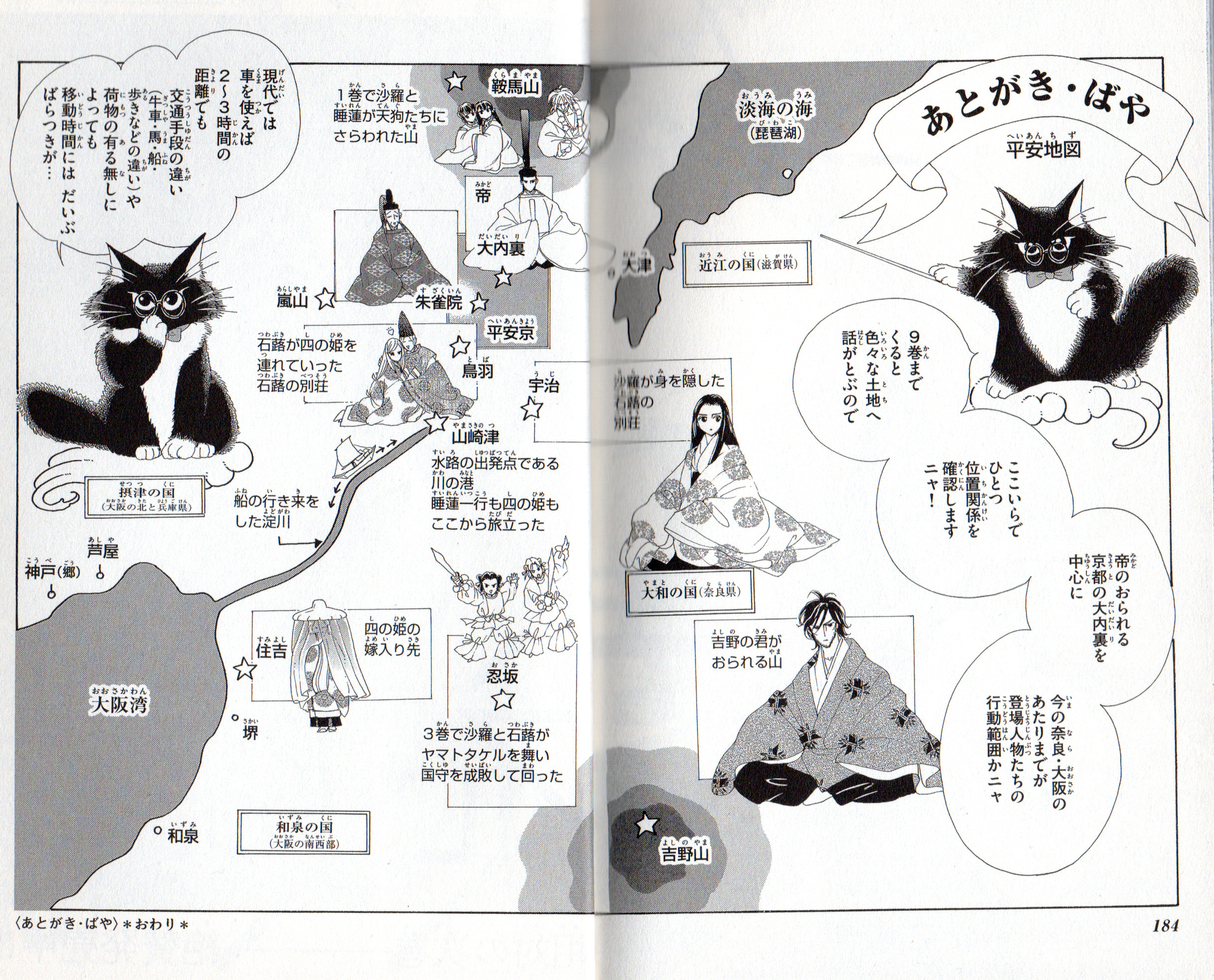 Now, as you may have gleaned from my previous post where I talked about checking out locations from the manga in person, places in Torikae baya are often portrayed in quite specific detail. Places like palace buildings are clearly drawn based on real-life counterparts, and Saito uses some of the afterwords in each volume to provide plans of Heian-kyo and the palace. For the latter, she points out that she made a few adjustments to the exact layout compared with what the real Heian court was like, but just having it drawn up is really helpful for understanding how everything comes together.